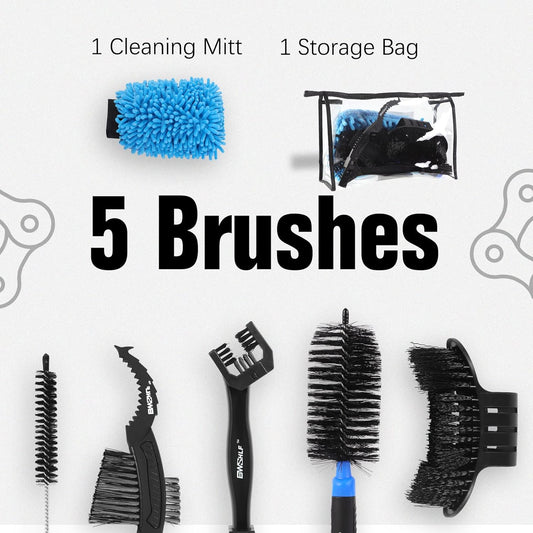 BWSHLF Bike Cleaning Kit (6 Pcs) with 1 Storage Bag, 5 Brushes for Tires, Chain, Sprockets, Cranks, Hubs, and Spokes, 1 Cleaning Mitt for Frame, Saddle, Clean Tools for MTB/Road/BMX/E-Bike/Gravel Bike