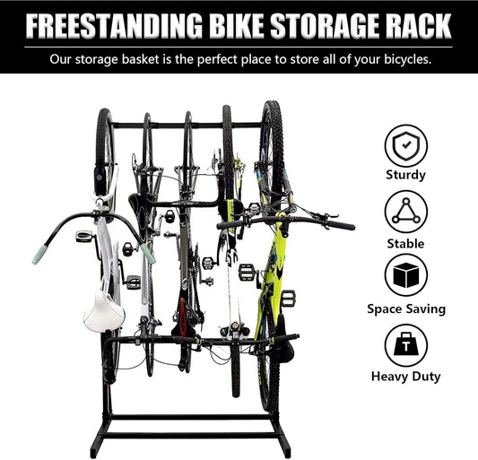 Upright Bike Stand, 5-Bike Stand Rack, Indoor Bike Storage Standing Bike - Garage Organizer - Freestanding Bicycle Rack with 5 Hanging Hook - Vertical & Horizontal Hangersfor Home