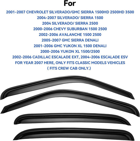 Window Visors Rain Guards for 2001-2007 Chevy Silverado/GMC Sierra, Window Vent Wind Deflectors Visors Shades for 2000-2006 Suburban/Yukon XL, 2002-2006 Avalanche/Cadillac Escalade - Crew Cab