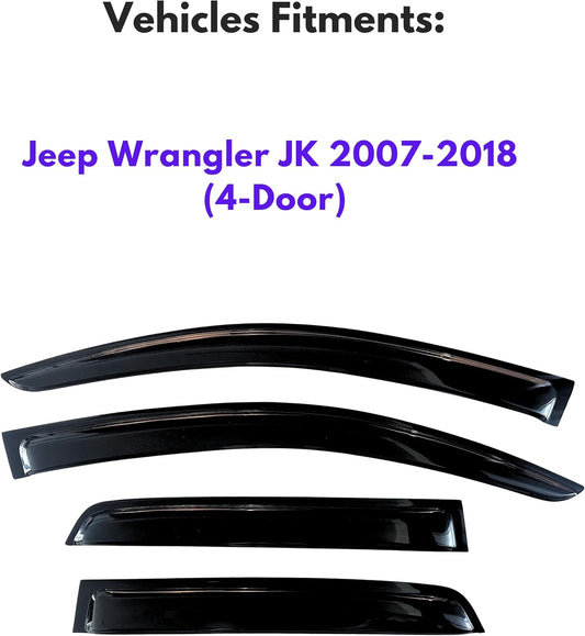 KPY Window Visor Compatible with Jeep Wrangler JK 2007-2018 4-Door, 4PC Rain Guard Side Window Vent Deflectors Tape-On Style, 2007 2008 2009 2010 2011 2012 2013 2014 2015 2016 2017 2018