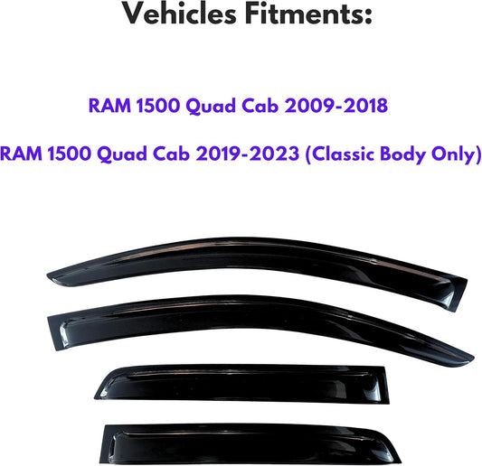 KPY Window Visor Compatible with 2009-2018 Dodge Ram 1500 Quad Cab, 4PC Rain Guard Side Window Vent Deflectors Tape-On Style, 2009 2010 2011 2012 2013 2014 2015 2016 2017 2018 (Quad/Extended Cab Only)