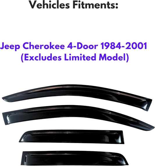 KPY Window Visor Compatible with Jeep Cherokee 4-Door 1984-2001 (Excludes Limited Model), 4PC Rain Guard Side Window Vent Deflectors Tape-On Style, 1992 1993 1994 1995 1996 1997 1998 1999 2000 2001
