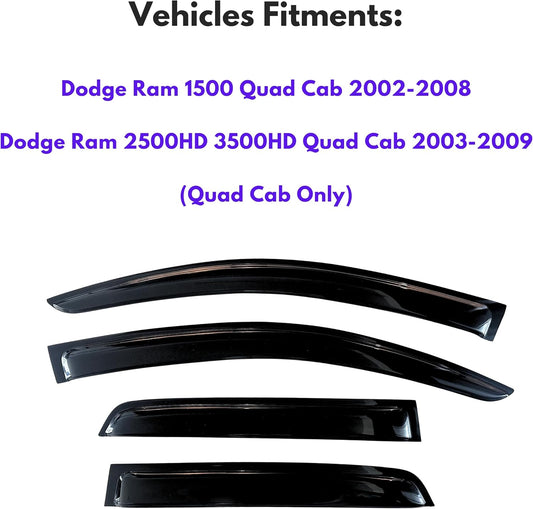 KPY Window Visor Rain Guard for 2002-2008 Dodge Ram 1500 Quad Cab, Tape-On Window Deflectors Vent Visor Shades for 03-09 Dodge Ram 2500 3500, 2002 2003 2004 2005 2006 2007 2008 (Quad/Extended Cab)