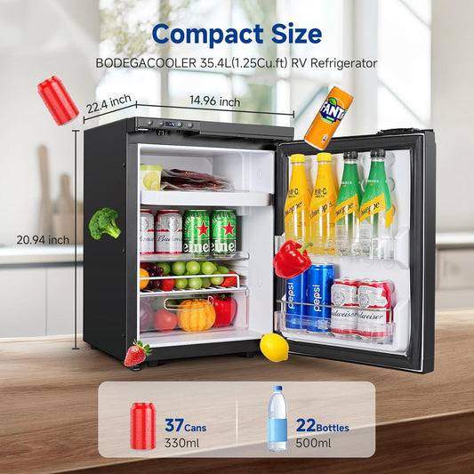 BODEGACOOLER 12 Volt RV Refrigerator, 35.4L(1.25Cu.ft) RV Fridge with Freezer, APP Control Car Refrigerator, (-4℉-46℉) Travel Compressor Cooler 12/24V DC for Boat, Yacht, Caravan, Truck, Camping
