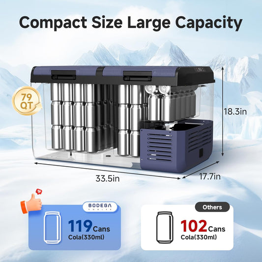 BODEGACOOLER 12 Volt Car Refrigerator, 79QT(75L) IPX4 Waterproof Electric Cooler, RV Car Fridge Dual Zone APP Control with 12/24V DC 110-240V AC, -4℉~68℉, Portable Freezer for Truck RV Camping, Travel