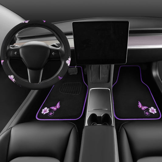 CAR PASS Universal Butterfly Car Seat Covers Front Set, Embroidered Flower Waterproof Car Floor Mats Carpet, Butterflies Steering Wheel Cover for Car Accessories Interior Sets (Black and Purple)