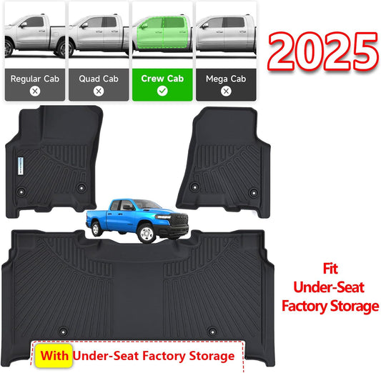 SANBAN Floor Liners for 2025 Dodge Ram 1500 Crew Cab(Rear with Under-Seat Factory Storage),TPE All Weather Protection 2 Rows Car Floor Mats.