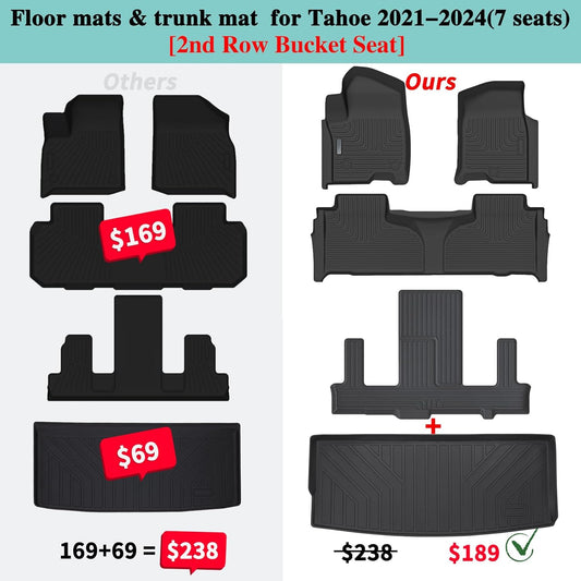 Floor Mats for 2021-2024 2025 Chevrolet Suburban 7 Seats (2nd Row Bucket Seats)(not fit 8 Seats)/ GMC Yukon XL(Only XL) & Trunk mat TPE Floor Liners & Cargo Liner for Chevy
