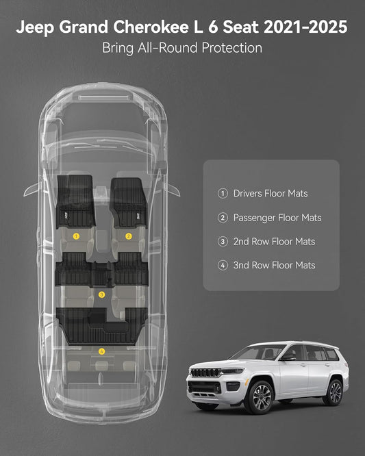 3W Floor Mats Fit for Jeep Grand Cherokee L 2021-2024 2025, TPE All Weather Custom Fit Floor Liner for 1-3 Rows Full Set Car Mats Black (Only for 6 Seater Without Center Console)