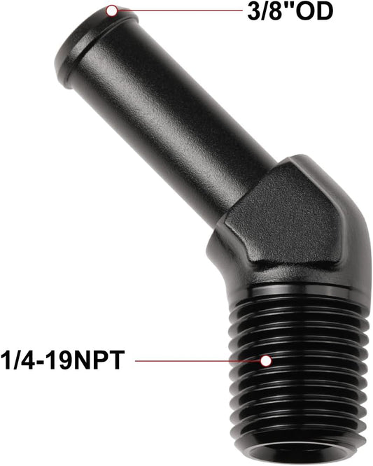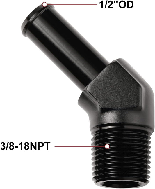 3/8 NPT Male to 1/2" Hose Barb Fitting Adapter 45 Degree Elbow Aluminum Black