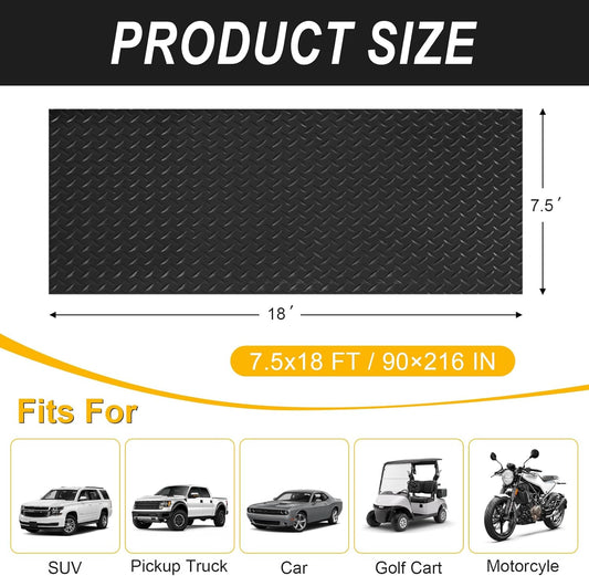 7.5x18 FT Garage Floor Mat, Flooring Roll with 20Pcs Tapes, 135 sqft Diamond Plate PVC Rubber Trailer Mat, Non-Slip Floor Mat for Garage, Warehouse, Gyms, Trailer, Pickup Truck (Black)