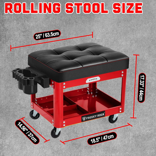 Rolling Mechanic Shop Stool with Wheels, Garage Mechanics Stool with 2 Layer Repair Tools Tray, Padded 360° Swivel Automotive Roller Creeper Seat Shop Chair, Heavy Duty, 330 LBS Capacity, Red