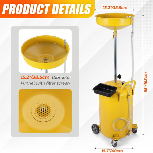 20 Gallon Waste Oil Drain Tank Portable Air Operated Oil Drainer with Adjustable Funnel Height 38-65 Inches 15 Inch Funnel Fluid Fuel Transfer Drain Container with 360 Degree Wheels and Toolbox Yellow