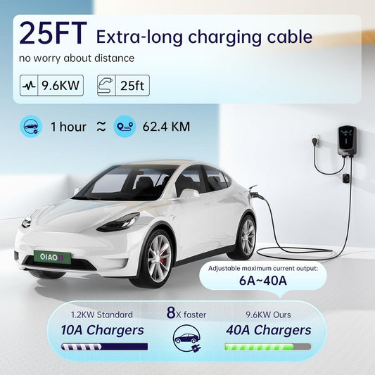 QIAO Level 2 EV Charger, Up to 40A Electric Car Charger, Wi-Fi Bluetooth APP Enabled EVSE, 4.3in Display, 25ft Cable, NEMA 6-50 Plug Charge Station Compatible with All SAE J1772 EV Models Black