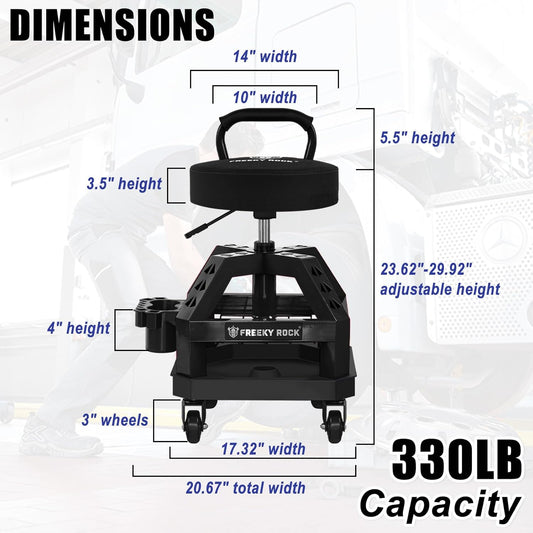 Rolling Shop Stool with Wheels, Garage Work Mechanic Stool with Backrest, Roller Mechanic Chair, Adjustable Height, 360° Swivel, Tool Tray Storage, 330 LBS Capacity, Heavy Duty, Black