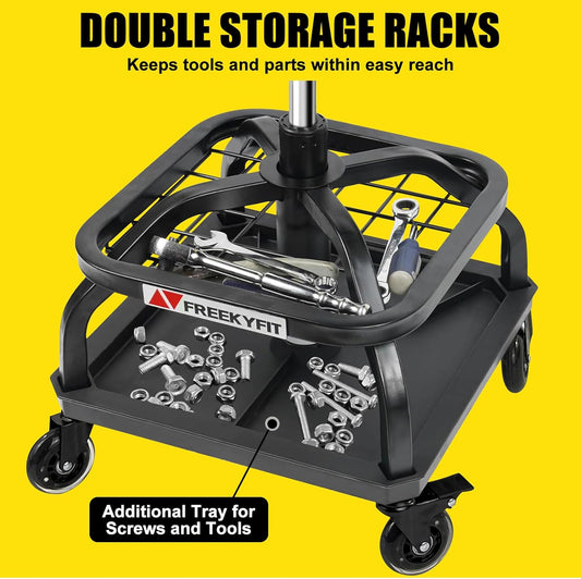 YELLOW JACKET Mechanic Stool with Wheels Rolling Stool Chair 300 lbs Capacity,Garage Mechanics Seat with Two Tool Tray and A Drawer Workshop Creeper Seat for Auto Repair Work