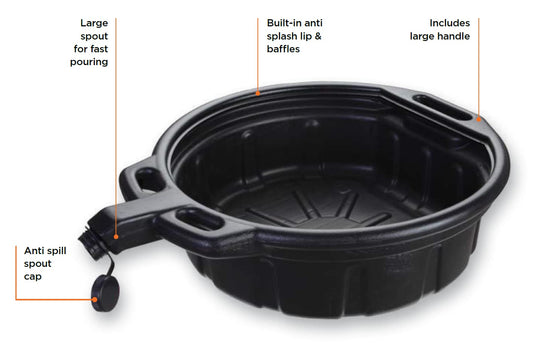 Groz 41960 4.25 Gallon Oil Drain Pan - with Spout Cap, Durable HDPE Construction, Spill-Proof Design for Auto Shops and Garages, Black Color