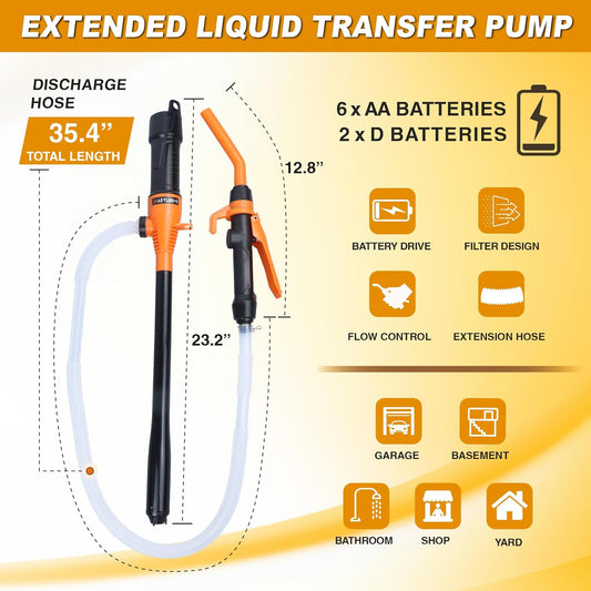 Battery Powered Stick Fuel Transfer Pump, 3.2 GPM, 51 Inch Transfer Length, Self-Hooking, For Transferring Gasoline, Kerosene, Diesel, and Non-Potable Water, Battery Powered Sump Pumps