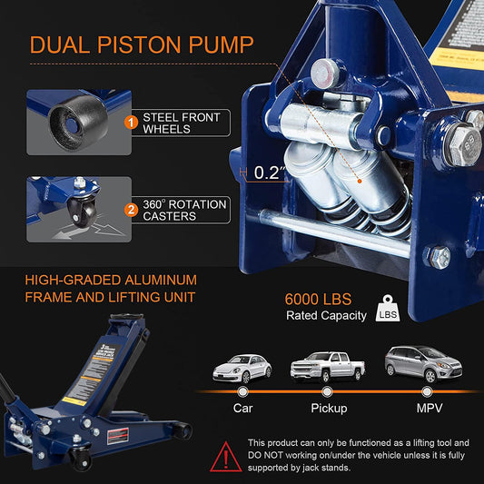 TCE ATZ830026XU-1 Torin Ultra Low Profile Floor Jack Heavy Duty Hydraulic Steel Service : Dual Piston Quick Lift Pump and Detachable Handle, 6,000 LBS Capacity, Blue
