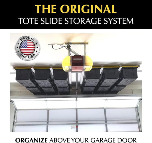 Tote Slide PRO – Made in USA | Heavy-Duty Alloy Steel Overhead Rack – Organize Up to 15 Storage Tote Bins on Garage Ceiling – 88” x 80” x 3.5”, White – Space-Saving Design