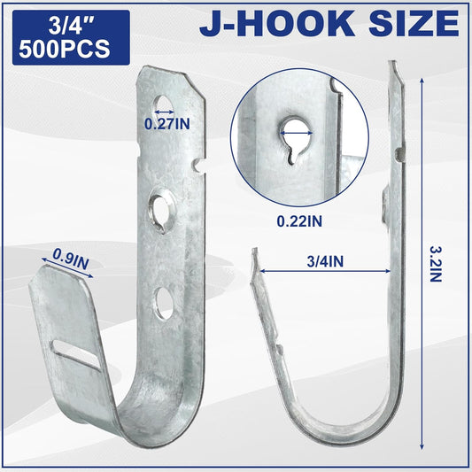 Gisafai 500 Pcs Cable Support J-Hook, 3/4 Inch Metal Garage Hooks for Hanging, Heavy Duty Network for Cable and Wire Management Wall Attaching J Utility, G60 Galvanized Steel, Silver