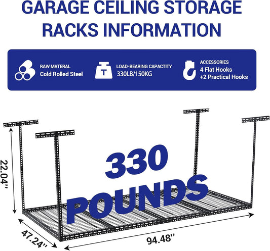 Overhead Garage Storage Rack 4x8 FT, Steel Ceiling Shelves 330lb Capacity, Height Adjustable 22-40 Inches, Space-Saving for Attic Basement Shed (Black, 4 Posts)