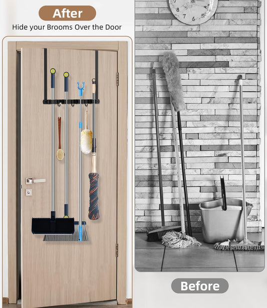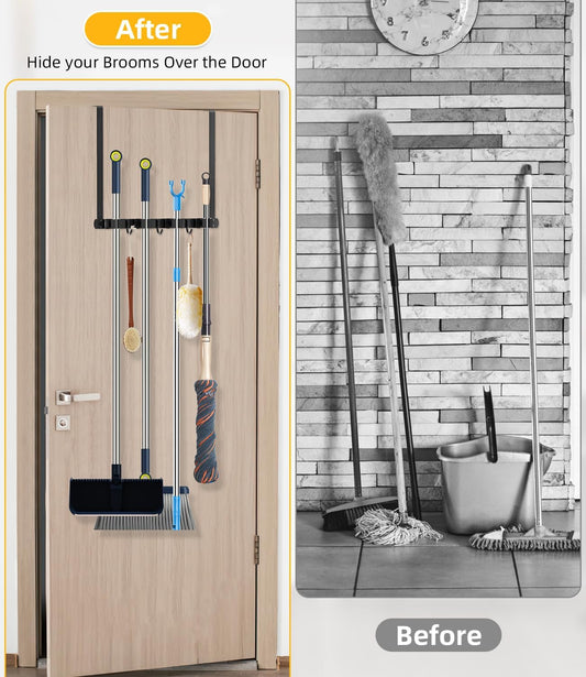 Broom Holder Over The Door - 304 Stainless Steel Mop and Broom Holder Wall Mounted or Hanging Over The Door with Hooks - Broom Hanger, Broom Storage Tool Organizer for Garage Closet Laundry