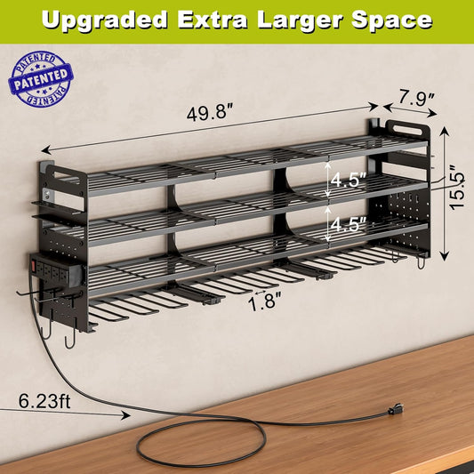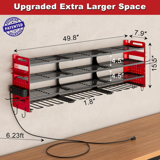12 Cordless Drill Holder Large Power Tool Organizer Wall Mount with Side Pegboard & Screwdriver Holder, 4-Tier Heavy Duty Metal Tool Storage Rack with 4-Outlet Power Strip