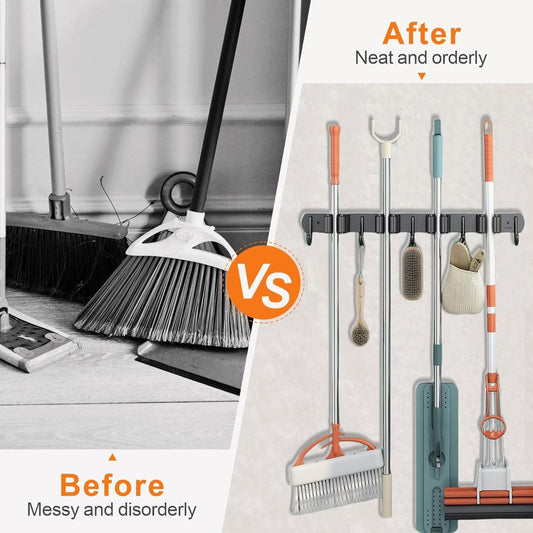Mop and Broom Holder Wall Mount, Upgraded Broom Organizer Wall Mount, Stainless Steel Broom Hanger Wall Mount for Home Kitchen Garden Laundry Garage (5 Racks with 4 Hooks Black)