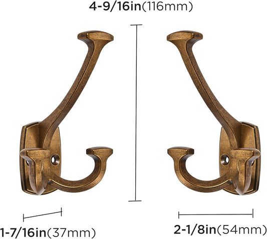 Large Wall Double-Sided Hook 2 Pack Antique Brass Hook Decorative Heavy Duty Solid Large Coat Hooks for Towel Hanging Coats Robe Towel Bags Door Back 2 Prong Hooks