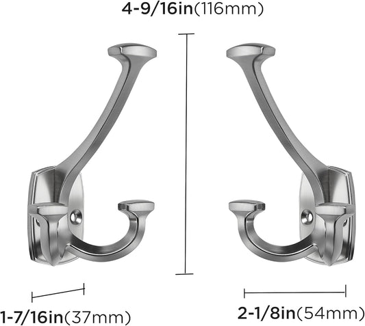 Large Wall Double-Sided Hook 2 Pack Brushed Satin Nickel Hook Decorative Heavy Duty Solid Large Coat Hooks for Towel Hanging Coats Robe Towel Bags Door Back 2 Prong Hooks