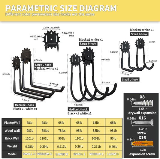 Garage Hooks Black & White 12 Pack, Heavy Duty Steel Tool Storage Utility Hook Organizing Power Tools, Wall Mount Holder for Bike, Ladder and Garden Chairs