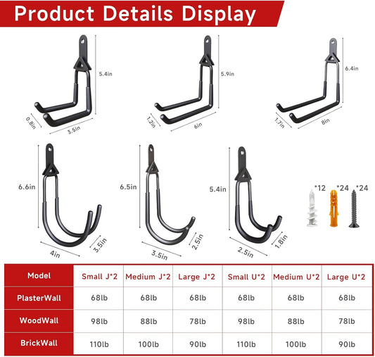 Heavy Duty Garage J Hooks - 4-Pack Wall Mount Organizer for Shop, Tools, Bike, Ladder with Installation Kits