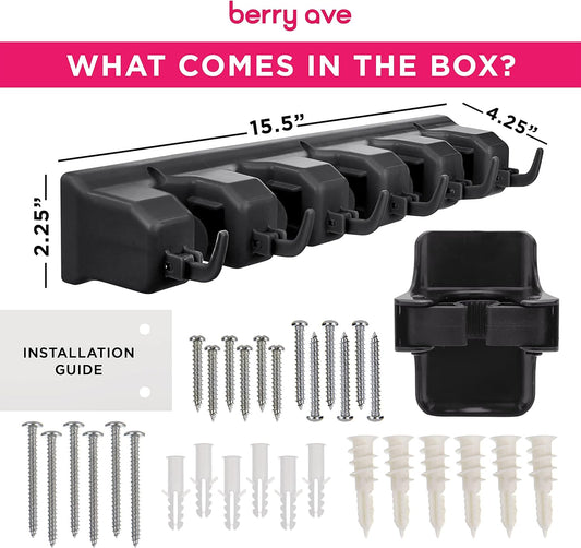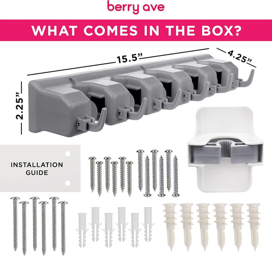 Berry Ave Broom Holder Wall Mount and Garden Tool Organizer, Closet Storage, Kitchen Rack, Home Organization and Garage Organizer for Rake or Mop Handles Up to 1.25-Inches, Hanger Plus 6 Hooks (Grey)