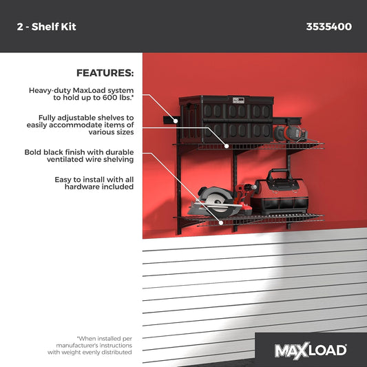 ClosetMaid MaxLoad Heavy Duty Wall Shelf Kit for Garage, 2 Shelves, Adjustable ShelfTrack Wire Shelving, Black Finish