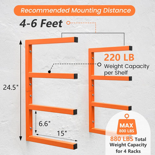 4 Pack Wood Organizer and Lumber Storage Rack Wall Mount, Heavy Duty Wood Storage Organizer Racks with 3-Level System for Garage, Workshop, Basement, Holds Up 220 LBS Per Level (Orange)