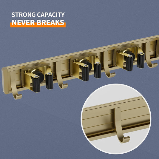 Broom Holder Wall Mount Mop and Broom Hanger Wall Mounted Garage Storage Rack Kitchen Garden Tool Organizer (5 Racks with 4 Hooks, Bronze)