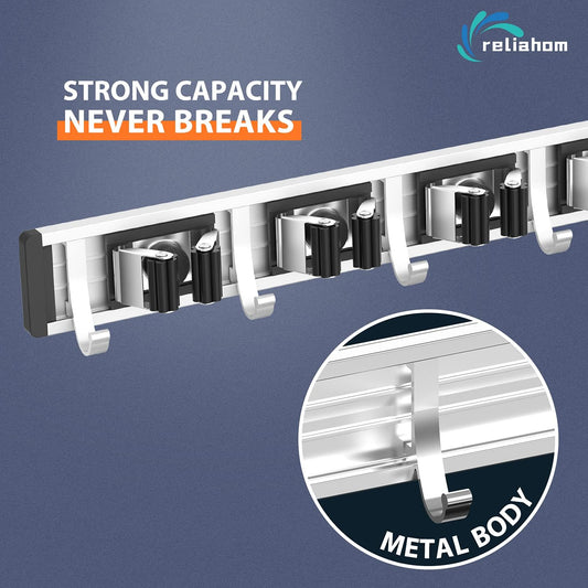 2 Pack Broom Holder Wall Mount Mop and Broom Hanger Wall Mounted Garage Storage Rack Kitchen Garden Tool Organizer (5 Racks with 4 Hooks, Silver)