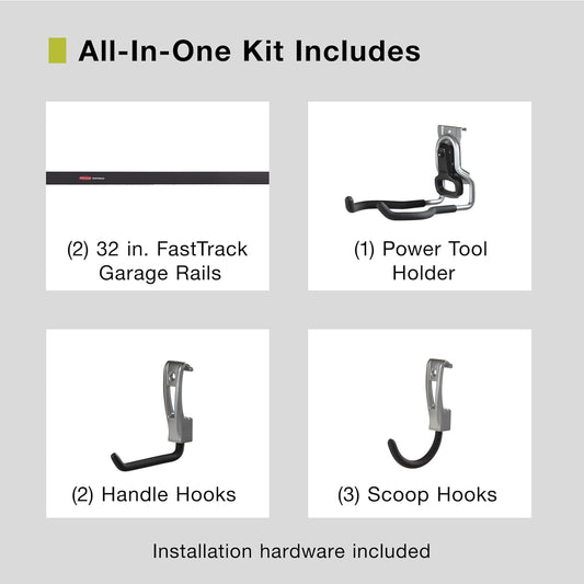 Rubbermaid Garage FastTrack 8-Piece Small Kit Black/Grey All-in-One Rail & Hook Wall Hanging Kit Wall Mounted Storage Solution for Home/Garage