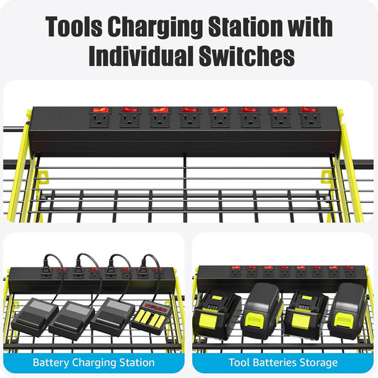 CCCEI Yellow Power Tool Organizer Wall Mount, Large Tools and Battery Storage Rack Charging Station Individual Switches. Drills Holder, Garage Utility Shelves with 6FT Power Strip. Gift for Men.