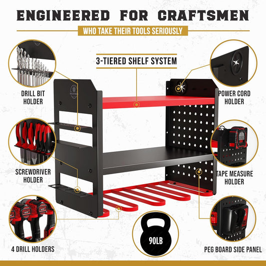 Power Tool Organizer Wall Mount - 3-Tier Heavy-Duty Metal Hand Tool Storage Rack, Utility Racks, Drill Holder, PegBoard Side, & More - Garage Storage Cordless Tool Organizer (Red)