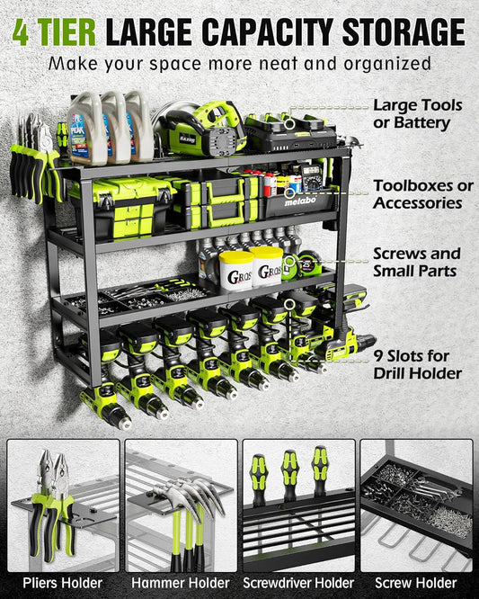 MAXIFFE 4 Layer Power Tool Organizer Wall Mount, Heavy Duty Metal Cordless Tool Organizers and Storage Rack Holder with 9 Drill Holders for Garage Storage Organization, Gifts for Men, Black, 26 inch