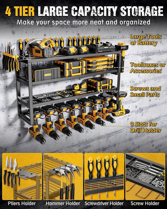 Upgrade Large power tool organizer Wall Mount,4 Layers Heavy Duty Metal Loads 400lbs Power Tool Hanger Shelf Battery Storage with 8 Cordless Drill Bit Holder,Utility Racks for Garage Tool Room