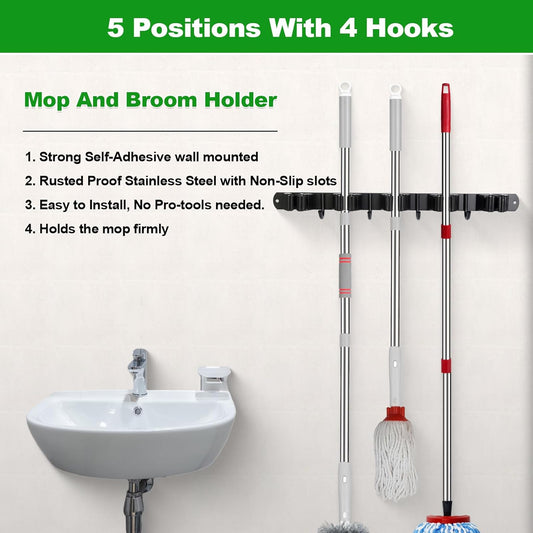 voze 5 Racks and 4 Hooks Mop and Broom Holder Wall Mount, Self Adhesive Heavy Duty Broom Hanger Organizer Storage Tool Racks for Kitchen Garden Laundry Garage Black