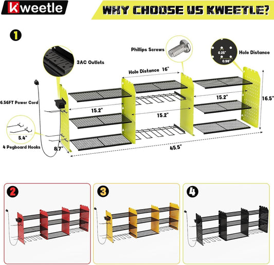 45" Power Tool Organizer Wall Mount with Charging Station - 3 Layer Storage Racks with 8 Cordless Drill Holder, 4 Hooks, Heavy Duty Garage Tool Organizer Storage for Workshop Shed Pegboard Basement