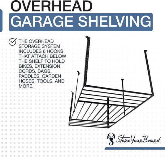 StoreYourBoard 4X8 Garage Storage Rack with Hooks, Ceiling Shelf Overhead Organization, Heavy Duty Steel Platform Holds 700 lbs, 96 in. x 48 in. x 40 in.