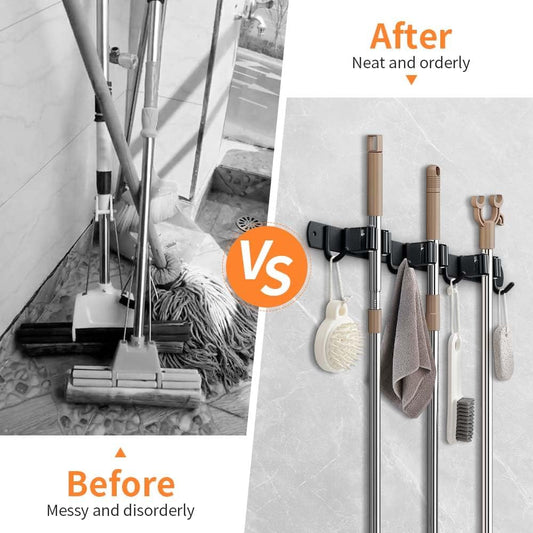 Broom Hanger and Mop Holder, Heavy Duty Garden Tool Organizer Rack Rake and Shovel Handle, Stainless Steel Wall Mounted Utility Rack with Screws (5 Racks with 4 Hooks, Matte Black).