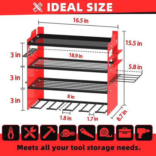 Power Tool Organizer Wall Mount with Charging Station 4 Layer 6 Slot Cordless Drill Holder with Angle Grinder Holder (Red)