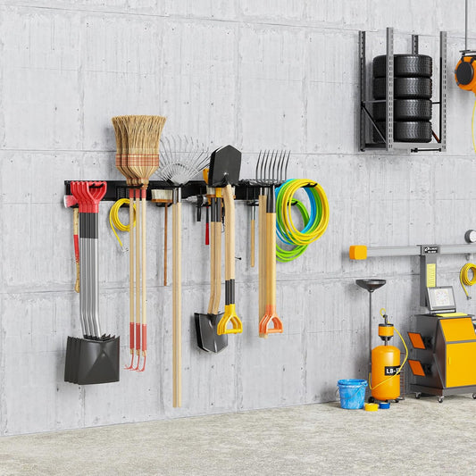 Garden Tool Organizer Wall Mount, Heavy Duty 48 Inches Garage Organization and Storage Racks for Yard Tools with 6 Hooks, Tool Hangers Holders for Hanging Folding Chair, Rake and Shovel