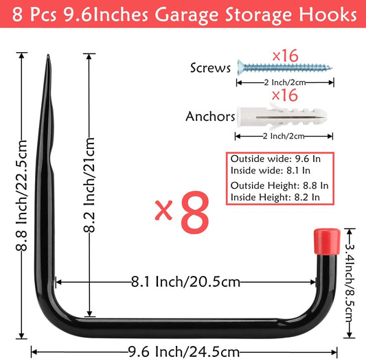 8 Pack Wall Mount Storage Hooks, 9.6IN Garage Utility Hanger for Ladder, Hold Chairs, Garden Tool, Hose, Bike Black +Red 9.6Inch x 8.8Inch